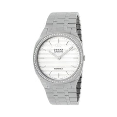 The GUCCI 25H's streamlined silhouette was inspired by the sleek forms of contemporary architecture. The watch is presented with a thin multi-layer case and five-link steel bracelet, while the design is completed by precious diamonds, white dial and black caliber engraving.