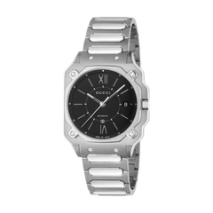 First introduced in the 1970s, the G-Flat watch pays homage to the heritage designs of the House with a modern touch. Characterized by octagonal angles and a multi-layered profile, the watch evokes the architectural landscape of the 1970s. This watch appears in stainless steel with black opaline dial, roman indexes and date opening.