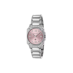 First introduced in the 1970s, the G-Flat watch pays homage to the heritage designs of the House with a modern touch. Characterized by octagonal angles and a multi-layered profile, the watch evokes the architectural landscape of the 1970s. This watch appears in stainless steel with pink galvanized dial and diamond indexes.