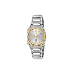First introduced in the 1970s, the G-Flat watch pays homage to the heritage designs of the House with a modern touch. Characterized by octagonal angles and a multi-layered profile, the watch evokes the architectural landscape of the 1970s. This watch appears in stainless steel with silver galvanized dial and diamond indexes.