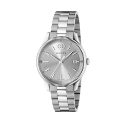The G-Timeless line continues to define the latest collections, highlighting the signature motifs of the House. Presented with a quartz movement, the accessory features a stainless steel bracelet enriched with a silver-toned dial. The emblematic Interlocking G adds a soft logo touch to the piece.