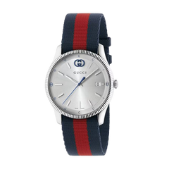 The G-Timeless line continues to define the latest collections, highlighting the signature motifs of the House. Presented with a blue and red nylon strap, the accessory features a stainless steel case and a silver-toned dial enriched with emblematic codes.