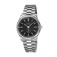 The season's polished look extends to watches and jewelry, including the G-Timeless collection. The round watch spotlights a sleek dial finish with subtle expressions of the Interlocking G, Gucci lettering, and signature motifs. Finished with a steel bracelet, the accessory is enriched with a small seconds display.