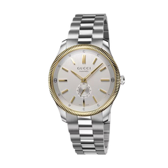 The season's polished look extends to watches and jewelry, including the G-Timeless collection. The round watch spotlights a sleek dial finish with subtle expressions of the Interlocking G, Gucci lettering, and signature motifs. Finished with a steel bracelet, the accessory is enriched with a small seconds display.