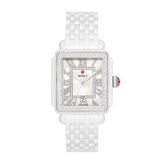 This Deco Madison watch shines with 263 hand-set diamonds (0.86 carat weight) along the bezel, white silver sunray dial with Roman numerals indexes and Swiss three-hand date movement. The seven-link ceramic bracelet is interchangeable with any 18mm MICHELE strap.