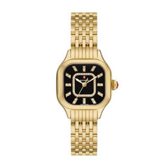 Elegant curves add modern elegance to the case of MICHELE's stunning Meggie watch that sparkles with 60 hand-set diamonds (0.19 carat weight) and a noir gloss dial with diamond inner ring and signature double diamond indexes. This watch features a Swiss movement and a gleaming 14mm 18K gold-plated seven-link bracelet made specifically for the Meggie collection interchangeable with any 14mm MICHELE strap.