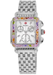 Brand New Authentic Michele Deco Soiree Diamond Mother of Pearl Dial Stainless Steel Women's Fashion Watch Model MWW06A000802. Polished Stainless Steel. case with Polished Stainless Steel Bracelet. watch band. Deployment clasp. Gemstone-Set bezel. Dial description: Silver Tone Hands and Diamond Hour Markers with 3 Sub Dials and the Date at 6 o'clock Displayed on a Mother of Pearl Dial. dial. Swiss Chronograph movement. Calendar: Date at 6 o'clock. Chronograph sub-dials display: 1/10th of a Second, 60 Second, 30 Minute, Date. Watch functions: Date, Hour, Minute, Second, Chronograph. Scratch Resistant Sapphire crystal. Rectangle case shape. Case size: 35mm x 33mm. Solid case back. 50 Meters - 165 Feet water resistant. 2 year WatchMaxx warranty.