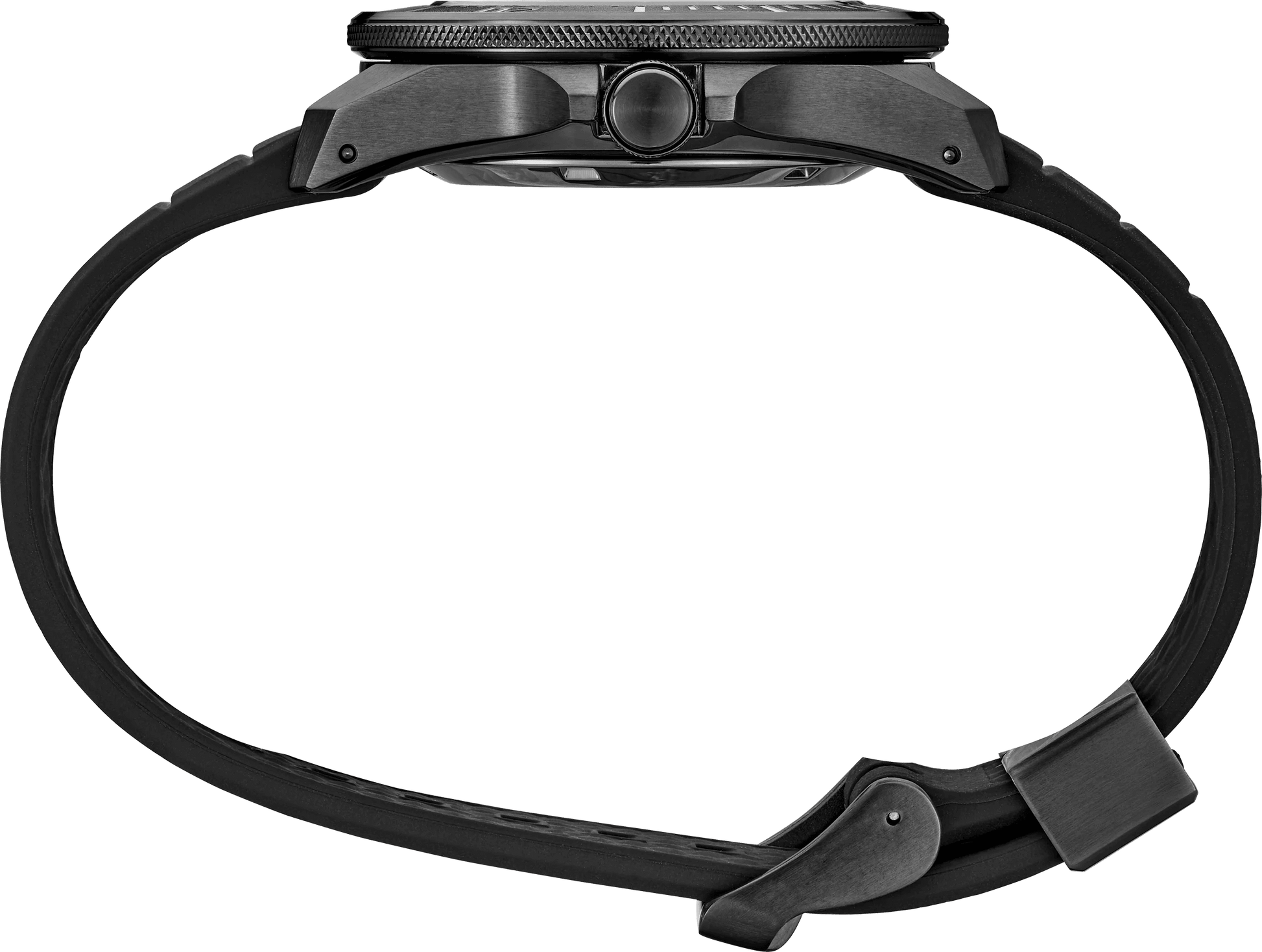 Prospex Automatic Diver. Designed for those who treat life as the ultimate adventure, the Seiko Prospex line meets every challenge with technological excellence and winning design. Inspired by Seiko’s most iconic diving styles, the case retains the straight contour of the original design with a sharpness enhanced by a sleeker more compact profile. For reliable timing in rough waters, the 23-jewel automatic movement beats at a frequency of 21,600 vibrations per hour, with a power reserve of approximately 41 hours, and can be wound manually or automatically. Framed by a black uni-directional rotating elapsed timing bezel, the black dial features a date calendar and LumiBrite hands and markers. Crafted of stainless steel with black hard coating, paired with a black silicone strap, this high-intensity timepiece follows ISO standards for scuba diving and is equipped with a secure screwdown crown and caseback. 200m Water Resistant