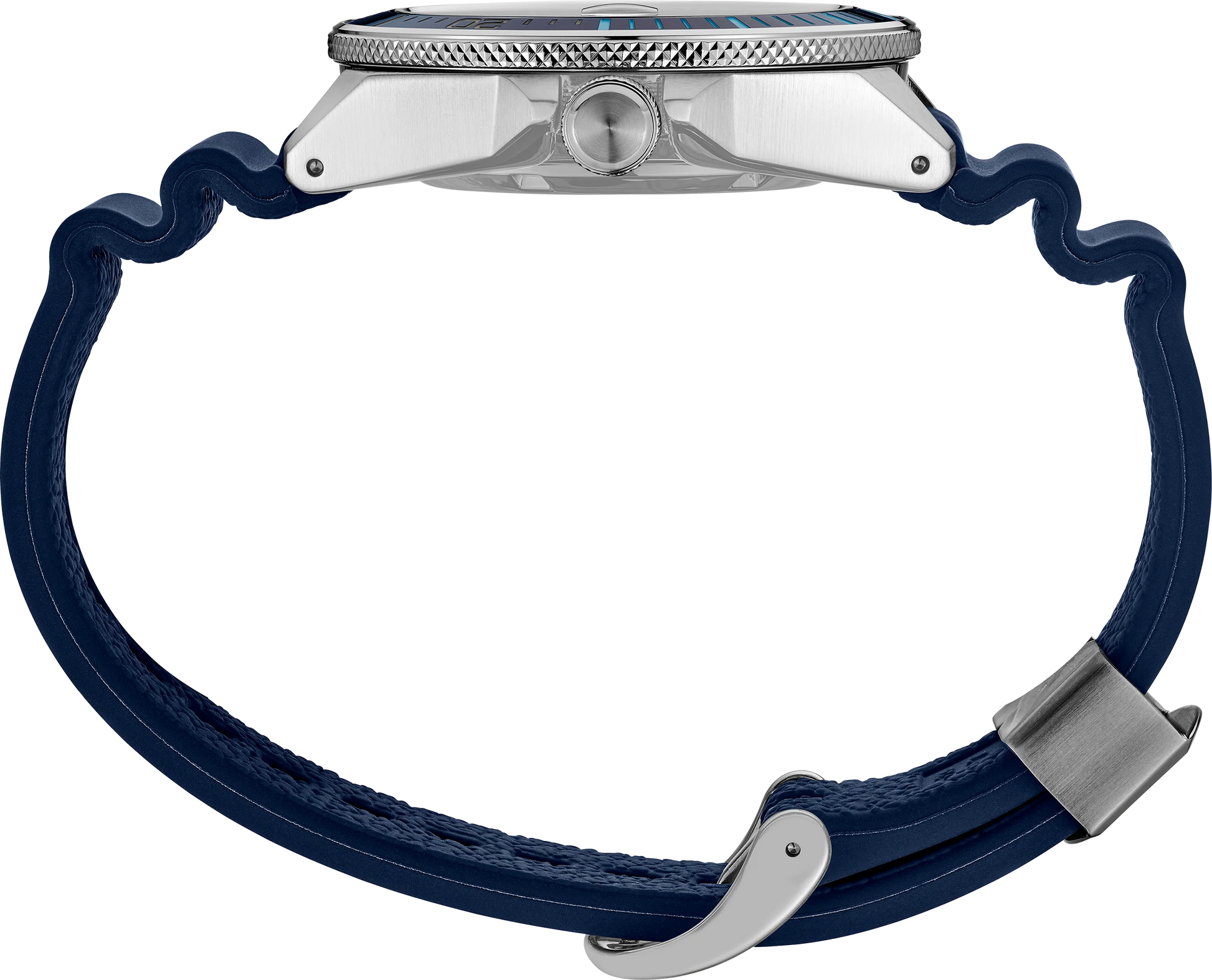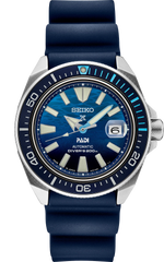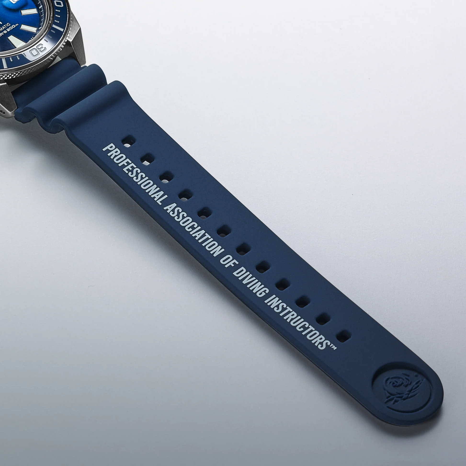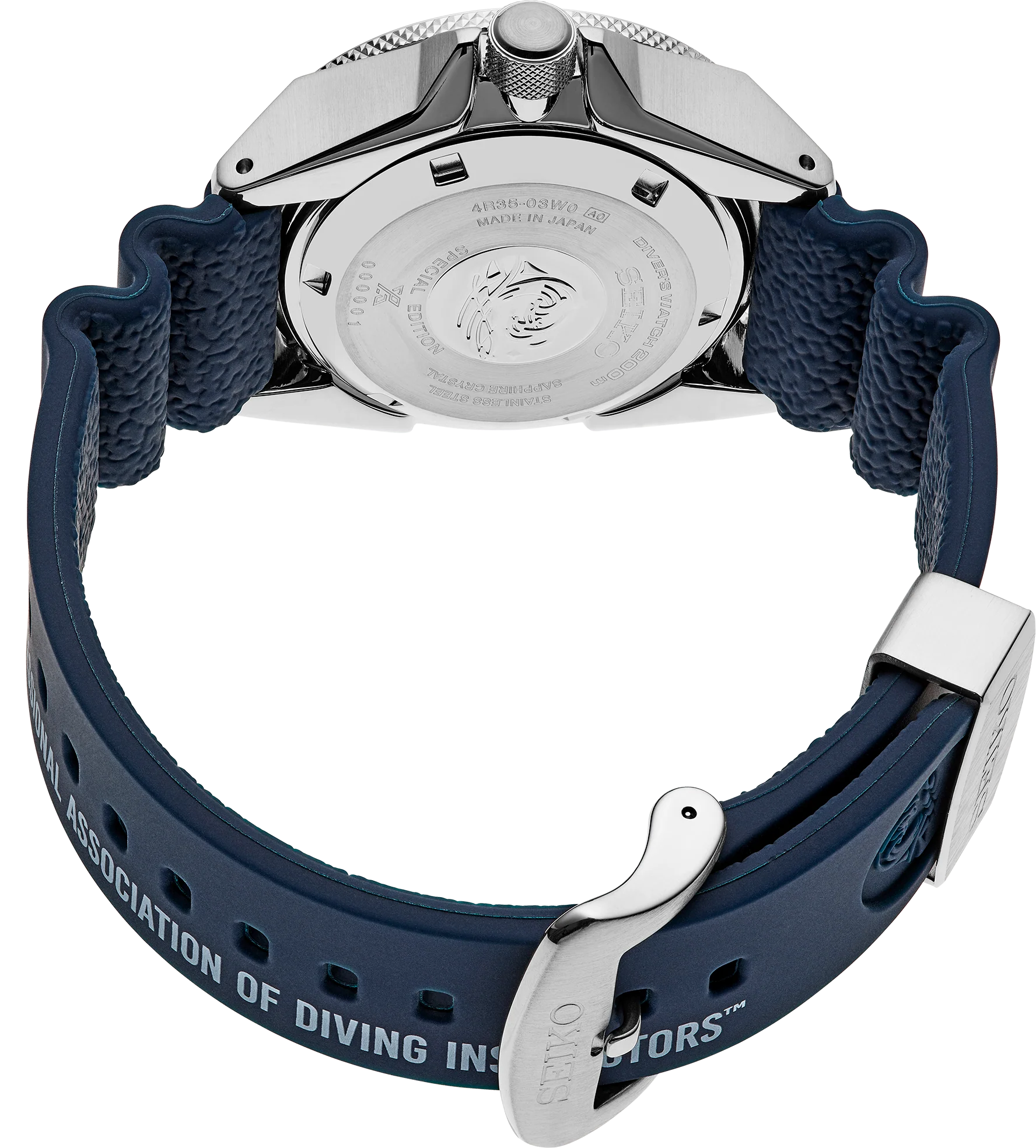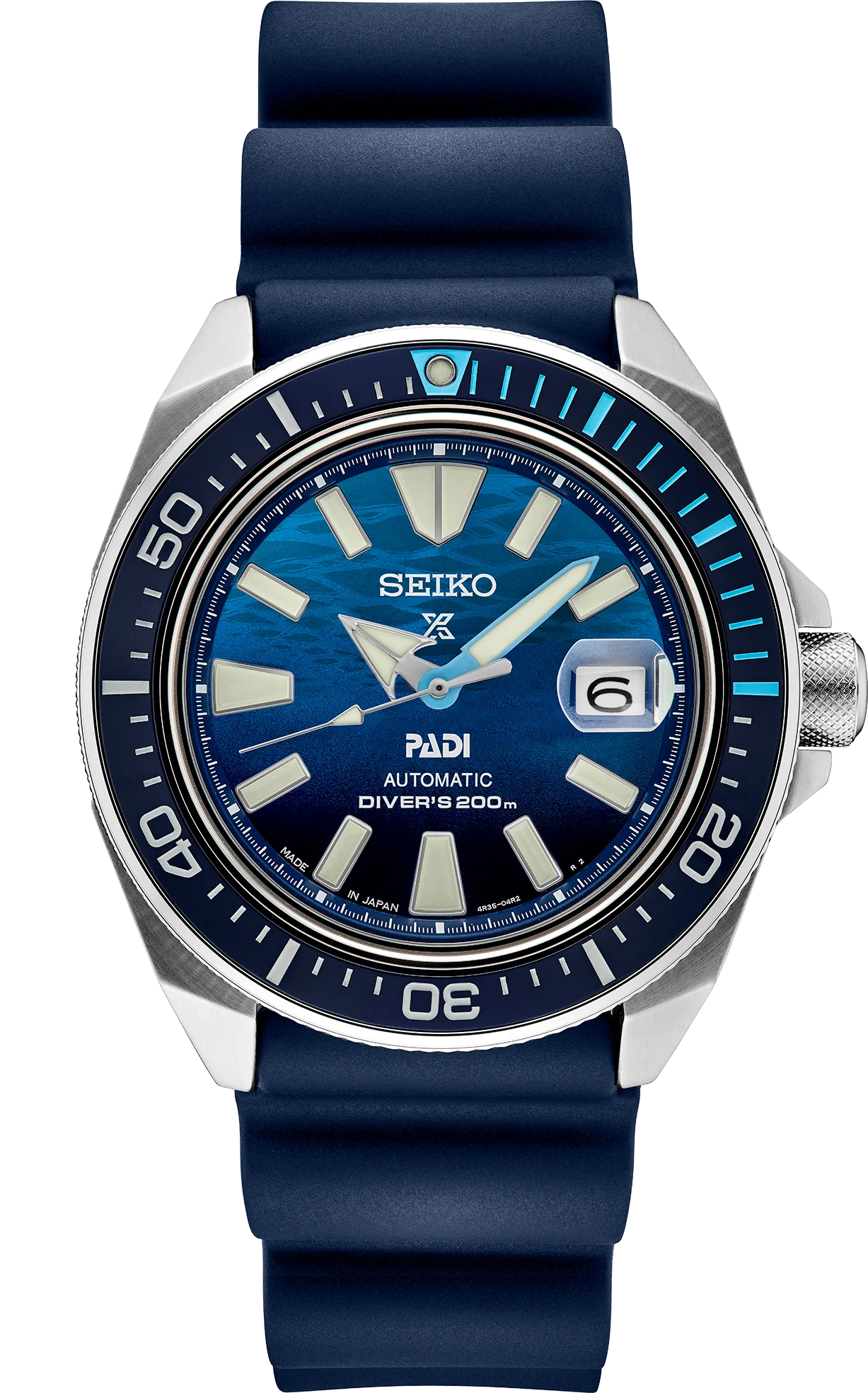 Prospex PADI Special Edition. Designed for those who treat life as the ultimate adventure, Seiko Prospex keeps moving forward, meeting every challenge with technological excellence and winning design. This stunning Special Edition celebrates Seiko’s official partnership with PADI, the world’s leading scuba diver training operation, particularly in the distinctive patterned and gradated blue dial reflecting the surface of the ocean as seen from under water as the sunlight reaches through the waves on the surface. With a magnified date calendar, the dial also features LumiBrite hands and markers with a unique blue glow recalling signature PADI colors, while vibrant blue accents on the blue ceramic uni-directional rotating elapsed timing bezel continue the PADI theme. Following ISO standards for scuba diving, this exceptionally durable timepiece offers a rugged stainless steel case based on one of Seiko’s most iconic diving styles, screwdown crown and caseback, sapphire crystal with anti-reflective coating on the inner surface, and a blue silicone strap. For reliable timing in rough waters, the 23-jewel automatic movement beats at a frequency of 21,600 vibrations per hour, with a power reserve of approximately 41 hours, and offers manual winding capability. 200m Water Resistant