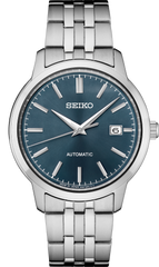 From the Essentials Collection. Adding classic automatic timekeeping to the Essentials Collection, this versatile timepiece winds with the movement of the wearer’s wrist, and never needs a battery. Visible through the screwdown see-through caseback, the 23-jewel movement beats at a frequency of 21,600 vibrations per hour, with a power reserve of approximately 41 hours and manual winding capability. With a sophisticated sunray finish, the blue dial includes a calendar and crisply defined hands and markers. Crafted of stainless steel, with tri-fold push button release clasp. 10 bar, 100M Water Resistant