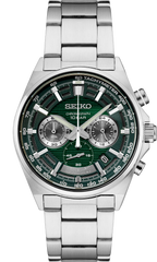 From the Essentials Collection. Inspired by racing, this rugged chronograph combines functionality and fashion for perfect sport or everyday wear. Framed by a green tachymeter outer ring, the dimensional embossed green dial features applied metallic elements and black and gray accents. Designed to suggest an engine compartment, the dial also offers three subdials, including a 24-hour indicator and a date calendar, as well as LumiBrite hands and markers. Chronograph timing provides measurement of up to 60 minutes of elapsed time in 1/5-second increments. Crafted of stainless steel, with tri-fold push button release clasp. 10 bar, 100M Water Resistant