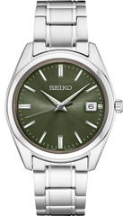 From the Essentials Collection. An updated classic, this sleek and versatile watch offers a clean, modern sunray dial, with simple stick indices and date calendar, in a new olive-toned green inspired by the deep color of the forest. Crafted of stainless steel with scratch-resistant sapphire crystal, secure screwdown caseback and tri-fold push button release clasp. 10 bar, 100M Water Resistant