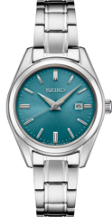 From the Essentials Collection. An updated classic, this sleek and versatile watch offers a clean, modern sunray dial, with simple stick indices and date calendar, in a new blue color inspired by the richness of water. Crafted of stainless steel with scratch-resistant sapphire crystal, secure screwdown caseback and tri-fold push button release clasp. 10 bar, 100M Water Resistant