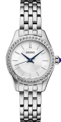 From the Crystal Collection. With 45 crystals set on the bezel and a classic cabochon crown, this elegant jewelry-inspired watch from the Crystal Collection features a clean and sophisticated white dial with a sunray finish, subtle center radial pattern, blue accents, and slim silver stick indices styled to suggest individual beams of light. Crafted of stainless steel, this graceful design includes a tri-fold push button release clasp. 5 bar, 50M Water Resistant