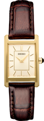 From the Essentials Collection. Offering classic dress/sport design, the Essentials Collection provides the ideal solution for everyday wear. Giving a new slant to a traditional rectangular style with a subtly patterned light champagne sunray dial, this perfectly tailored watch features a stainless steel case in gold finish, cabochon crown and textured brown leather strap. 3 bar, 30M Water Resistant