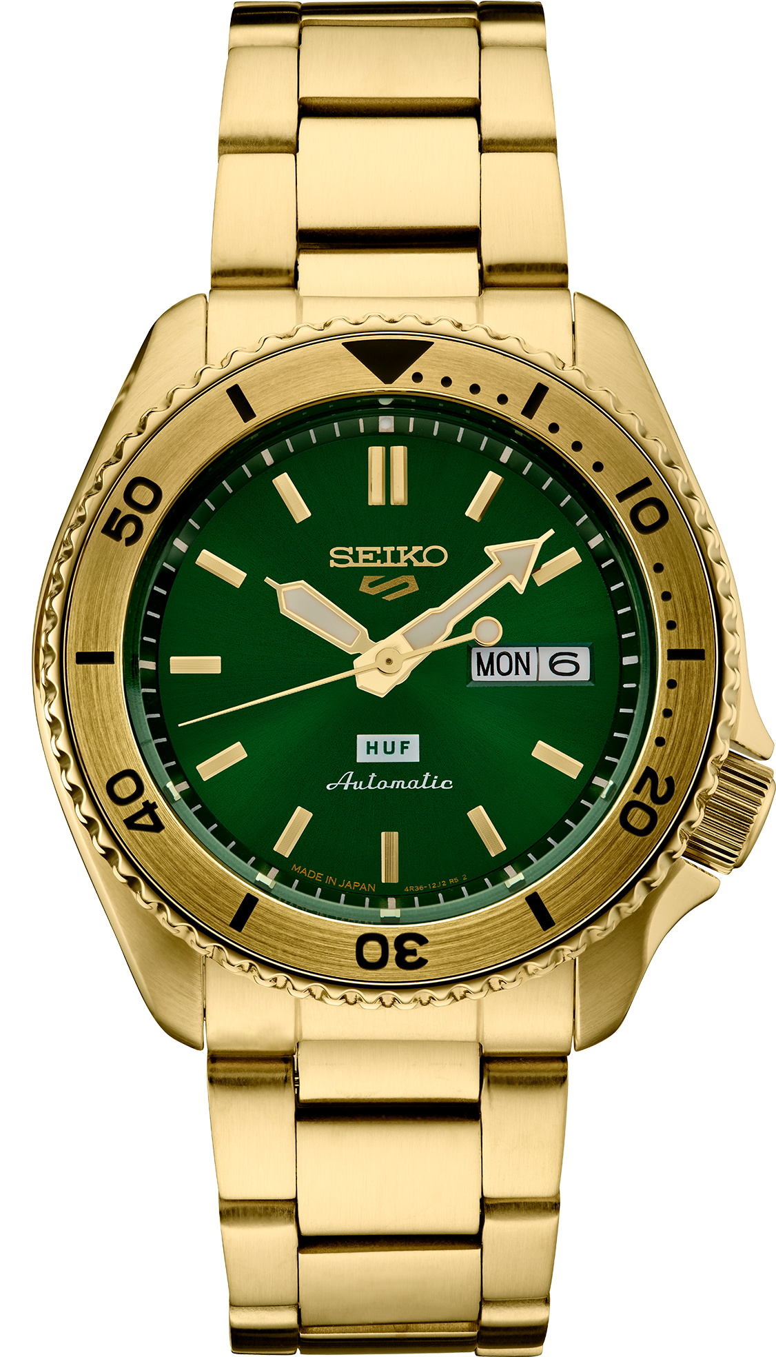 Green sunray dial with classic bar indices and white HUF logo