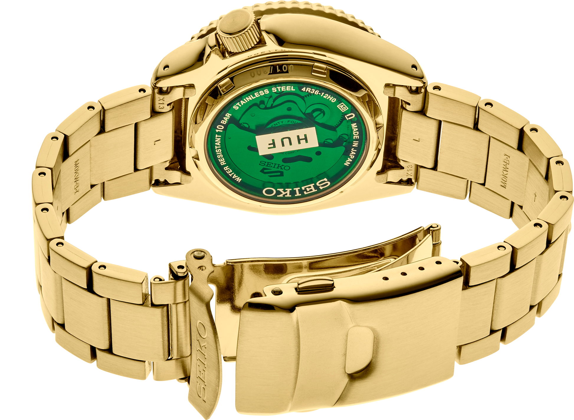 Green screwdown see-through caseback with the HUF logo and Limited Edition serial number