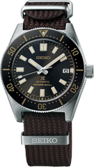 1965 Heritage Diver's Watch. Designed for those who treat life as the ultimate adventure, the Seiko Prospex line meets every challenge with technological excellence and style. Part of a rich legacy of innovation in high-intensity timekeeping, Prospex continues to celebrate a long history of sports watch excellence with re-creations and re-interpretations of landmark achievements. Updated with today's technology and materials, and a sleeker and thinner profile, this rugged timepiece reimagines Seiko's 1965 first diver's watch, an automatic timepiece with a then exceptional water resistance of 150 meters. Offering an extraordinarily legible dial and durable enough to become standard equipment on the Japanese Antarctic Research Expedition (JARE), this landmark watch propelled Seiko into the forefront of dive watch design. This re-interpretation features another advance, with a special high-intensity fabric strap, made in Japan with superior flexibility, but the strength necessary for diving. A beige fabric alternate is included with the brown fabric primary strap. The rich brown dial offers a date calendar and LumiBrite hands and markers, framed by a black uni-directional rotating elapsed timing bezel. With a power reserve of approximately 70 hours, the 24-jewel automatic movement beats at a frequency of 21,600 vibrations per hour, and provides manual winding capability. Crafted of stainless steel with super-hard coating, this superbly functional timepiece features a curved sapphire crystal with anti-reflective coating on the inner surface, and a screwdown crown and caseback, and follows ISO standards for scuba diving to depths of up to 200 meters. 200m Water Resistant