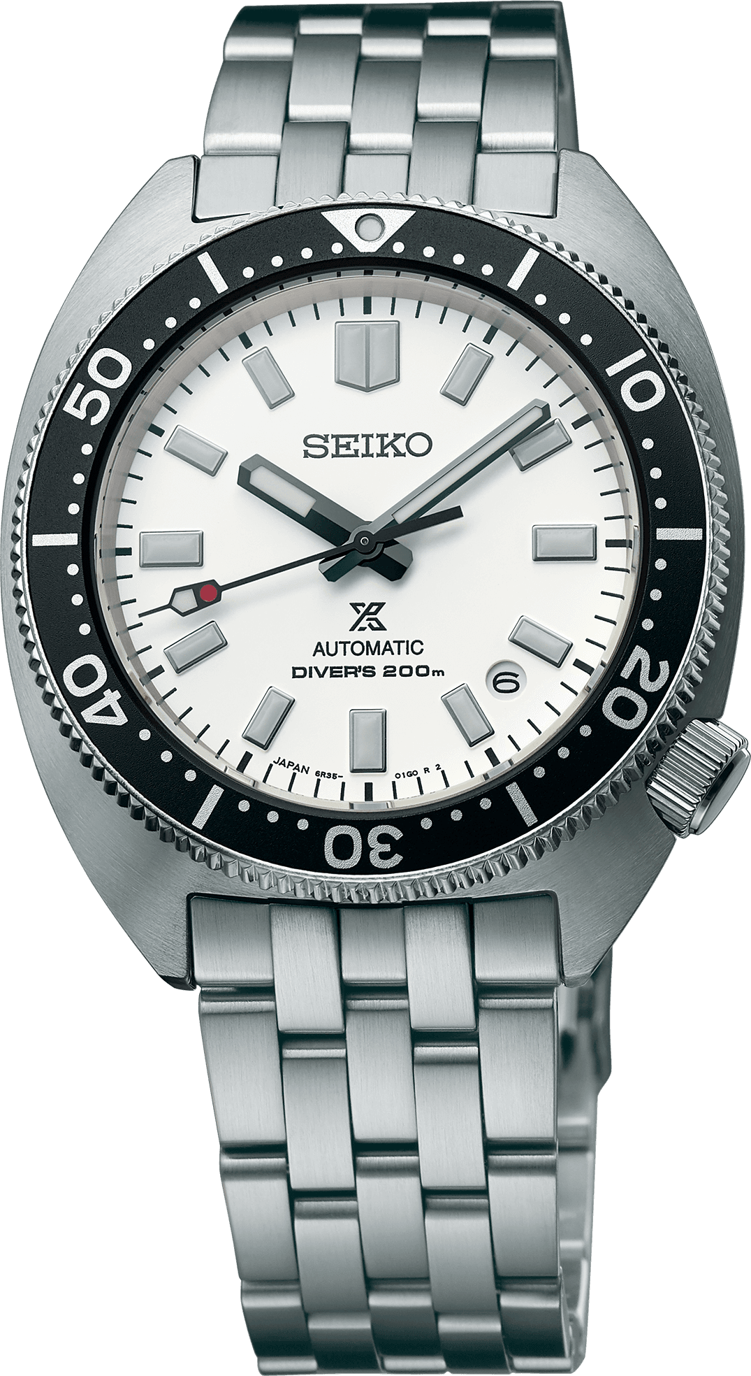 Prospex Automatic Diver's Watch. Designed for those who treat life as the ultimate adventure, the Seiko Prospex line meets every challenge with technological excellence and style. Part of a rich legacy of innovation in high-intensity timekeeping, Prospex continues to celebrate a long history of sports watch excellence with re-creations and re-interpretations of landmark achievements. With the thinnest case to date of any Seiko automatic diver's watch, as well as an elegant, yet sporty five-row bracelet, this sleekly updated timepiece incorporates the distinctive cushion-shape and recessed crown of one of Seiko's most iconic designs. Crafted of stainless steel with super hard coating, this versatile watch includes a curved sapphire crystal with anti-reflective coating on the inner surface, black uni-directional rotating elapsed timing bezel, screwdown crown and caseback, and a newly developed compact tri-fold clasp with secure lock and extender. The clean white dial features a date calendar and LumiBrite hands and markers. Following ISO standards for scuba diving to depths of up to 200 meters, this exceptional timepiece offers manual winding capability and includes a 24-jewel automatic movement with a frequency of 21,600 vibrations per hour and a power reserve of approximately 70 hours. 200m Water Resistant