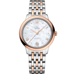 A timeless collection since 1994, the OMEGA De Ville Prestige is now in its third generation Continuing to represent classical design and refined elegance, the timepieces offer a range of patterns, finishes and colours to suit different lifestyles and personalities In this 34 mm stainless steel - 18K Sedna™ Gold model, the dial is crafted from white mother-of-pearl The display is distinguished by PVD Sedna™ Gold coloured hands, as well as alternating Roman numerals and cabochon indexes The pure look of the timepiece is completed by a date window at 6 o’clock, and a dotted minute track on the outer zone This Master Chronometer certified watch is presented on a stainless steel - Sedna™ Gold bracelet and is driven by the OMEGA Master Co-Axial Calibre 8800, which can be admired through the scratch-resistant sapphire crystal caseback