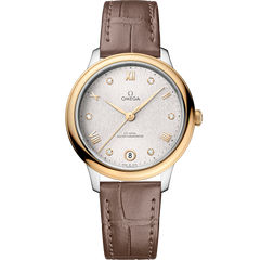 A timeless collection since 1994, the OMEGA De Ville Prestige is now in its third generation Continuing to represent classical design and refined elegance, the timepieces offer a range of patterns, finishes and colours to suit different lifestyles and personalities In this 34 mm stainless steel - 18K yellow gold model, the silvery dial features a stamped random vertical pattern in a sun-brushed finish The display is distinguished by yellow gold-plated hands, as well as alternating Roman numerals and diamond markers The pure look of the timepiece is completed by a date window at 6 o’clock, and a dotted minute track on the outer zone This Master Chronometer certified watch is presented on a shimmering taupe brown leather strap and is driven by the OMEGA Master Co-Axial Calibre 8800, which can be admired through the scratch-resistant sapphire crystal caseback