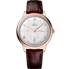 A timeless collection since 1994, the OMEGA De Ville Prestige is now in its third generation Continuing to represent classical design and refined elegance, the timepieces offer a range of patterns, finishes and colours to suit different lifestyles and personalities In this 41 mm 18K Sedna™ Gold model, the domed silvery dial features a crystal finish The display is distinguished by PVD Sedna™ Gold coloured hands, as well as alternating Roman numerals and cabochon indexes The 270° power reserve indication is located at 6 o’clock It is illustrated by 4 sectorial cut-throughs in crescent shape and an applied underplate in subtle contrasting finish of the same colour The pure look of the timepiece is completed by a date window at 6 o’clock, a small-seconds subdial at 9 o’clock, and a railway minute track on the outer zone This Master Chronometer certified watch is presented on a burgundy leather strap and is driven by the OMEGA Master Co-Axial Calibre 8810, which can be admired through the scratch-resistant sapphire crystal caseback