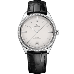 Characterised by its thin and elegant case, the Trésor line was first launched by OMEGA in 1949 and housed the legendary 30mm calibre More than half a century later, it continues to impress with one of today’s most advanced mechanical movementsThis model has a 40 mm stainless steel case with a diamond-paved bezel and is presented on a black leather strap The domed opaline silvery dial includes a date window at 6 o'clock as well as hands and indexes in 18K white goldInside, this De Ville Trésor is powered by the OMEGA Co-Axial Master Chronometer Calibre 8910 and is certified at the industry’s highest standard of precision, chronometric performance and magnetic resistance