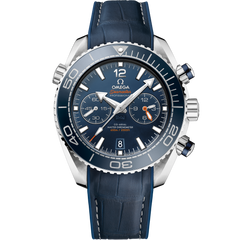It was with OMEGA’s maritime legacy in mind that the brand launched its Planet Ocean line in 2005 The stylish OMEGA Seamaster Planet Ocean 600M Master Chronometer Chronograph pays homage to OMEGA’s dive watch heritage This model, with its scratch-resistant sapphire crystal, features a blue ceramic dial with Arabic numerals and a date window at the 6 o’clock position The dial presents a small seconds sub-dial, as well as 60-minute and 12-hour counters on one dial for intuitive reading of elapsed time The blue ceramic unidirectional rotating divers’ bezel, with its Liquidmetal™ diving scale, is mounted on a 455 mm stainless steel case Other features include an alveol screw-in caseback and a blue leather strap with rubber lining The OMEGA Seamaster Planet Ocean 600M Master Chronometer Chronograph is water resistant to 60 bar (600 metres / 2000 feet), and has a helium-escape valve The OMEGA Master Chronometer calibre 9900 at the heart of this timepiece can be seen through the transparent caseback To achieve Master Chronometer status, it has passed the 8 rigorous tests set by METAS (The Swiss Federal Institute of Metrology)