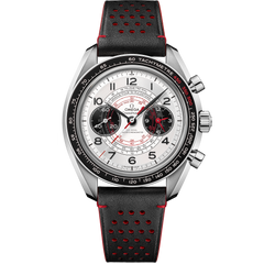 The Chronoscope collection has taken the legendary Speedmaster design and combined it with inspiration from OMEGA’s chronograph wristwatches from the 1940s This 43 mm model is crafted in stainless steel with a silvery dial with blackened subdials Along with a black anodized aluminium bezel ring with its tachymeter scale, the leaf-shaped hands and Arabic numerals are also blackened, with a unique “spiral” track pattern running beneath the numbers Most notably, the dial is printed with three distinctive timing scales in a 1940’s “snail” design, including a tachymeter scale, a pulsometer scale and a telemeter scale Presented on a perforated black leather strap with a red interior, the watch features a black small-seconds counter at 9H, and a black 60-minute and 12-hour recorder at 3H with red hands Inside, the timepiece is driven by the OMEGA Co-Axial Master Chronometer Calibre 9908