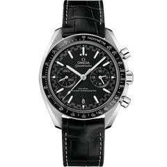 This Speedmaster Racing Master Chronometer model features a 44.25 mm stainless steel case on a black leather strap and a black ceramic bezel ring that includes the famous tachymeter scale in Liquidmetal™ On the black dial, there is a distinctive racing style minute-track which gives the watch its name. There are also two subdials with blackened applied rings as well as a 6 o’clock date window that blends with the colour of the dial. The hour and minute hands are rhodium plated while the arrowhead indexes are 18K white gold with white Super-LumiNova. The watch is driven by the OMEGA Co-Axial Master Chronometer 9900, certified by METAS at the industry’s highest standard.