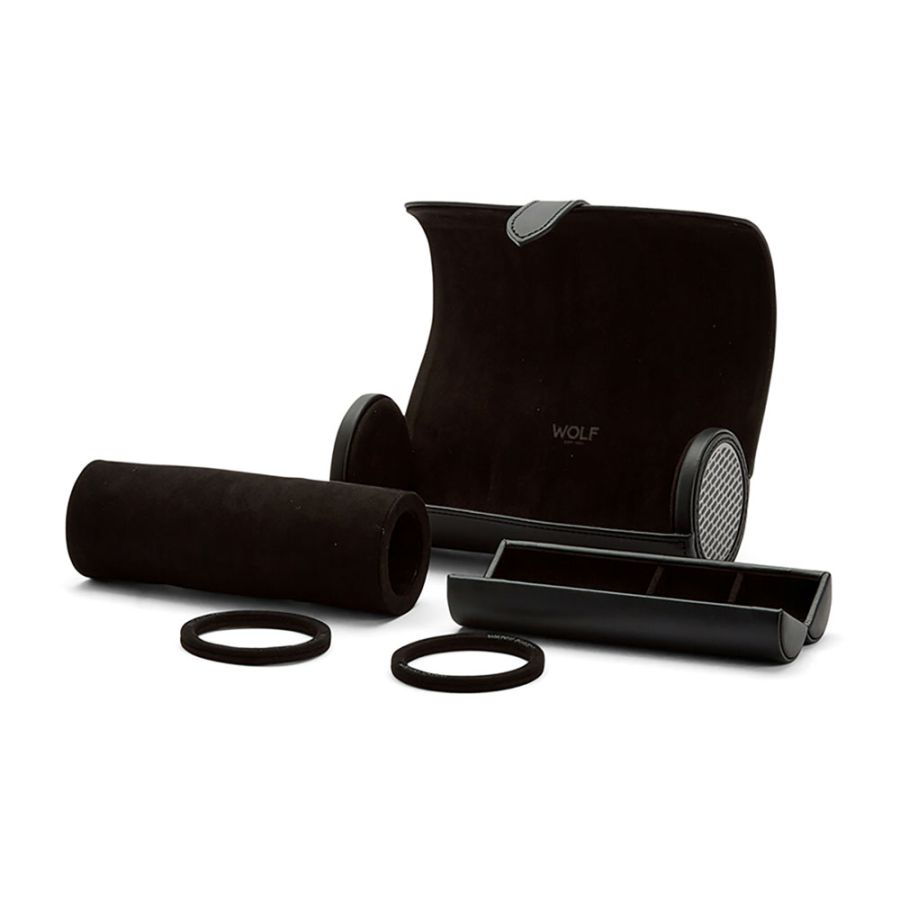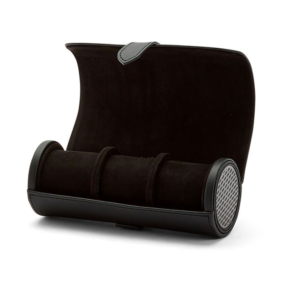Keep your timepieces safe and secure in style with this Axis Triple Watch Roll. Includes space for 3 watches, with 2 Watch Guards and snap closure. Featuring a secret jewellery capsule (patent pending) inside of the watch roll with three compartments for safe keeping of cufflinks, rings and other smaller valuables.
