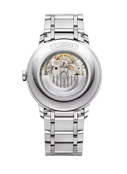 A classic stainless steel automatic watch with iconic line guilloché décor and masculine blue steel hands, the Classima 10334 is the luxury timepiece to suit the tastes of the modern urban professional. The 42 mm round watch is powered by mechanical self-winding movement, visible beneath the scratch-resistant sapphire crystal case back. It features Roman numerals to mark the hours as well as black minute and second indicators around the edge of the silver dial and a polished steel bracelet.