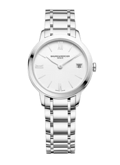 A women’s steel watch that balances strength and elegance, the Classima 10335 has a round 31 mm stainless steel case and matching bracelet with a triple folding clasp and security push-pieces. The rhodium-plated hands sweep around the pure white dial, which features classic Roman numerals and a date aperture at 3 o’clock. This urban chic steel bracelet watch for her is driven by Swiss made quartz movement.