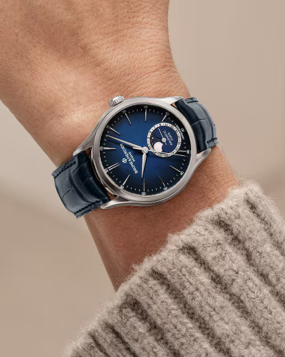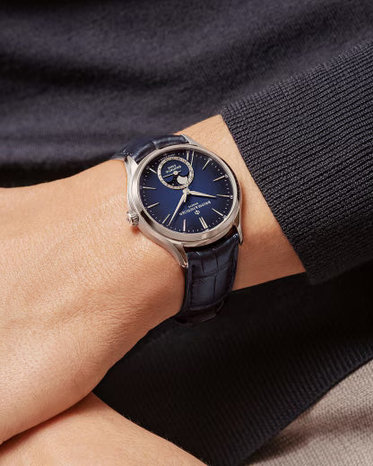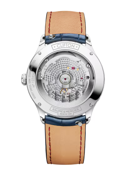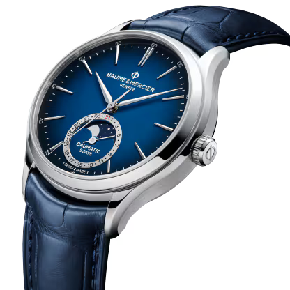 As the ultimate expression of the round timepiece, this sophisticated wristwatch with interchangeable blue alligator strap is designed for today's active man. It is equipped with a Baumatic manufacture movement with a five-day power reserve. The traditional moon-phase complication at 6 o'clock enhances the gradient blue lacquered dial, with a date indication.
