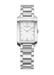 With rhodium-plated Arabic numerals, sword-shaped hands and a Swiss quartz movement, this rectangular watch for women balances graceful design and enduring quality. The watch bracelet is easily interchangeable, giving the wearer the freedom to transform her look when she wants.