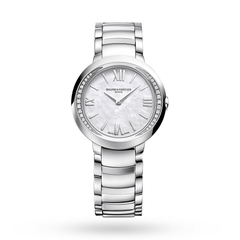 Embodying a strong and precious bond, this 30mm diameter polished steel watch is distinguished by an oval bezel subtly enhanced by the presence of 30 finely set diamonds. A true promise of enduring commitment, this piece features a white mother-of-pearl dial with "drape" decor combining Roman numerals and indexes for a pure, refined aesthetic.