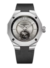 At first glance, it evokes the moon in its hues and mysteries. Wearing a grey rubber strap with canvas decoration, the new Riviera Baumatic"Moonphases"is sober. Its sand-colored dial is reminiscent of the large silvered deserts that make up the poetic landscapes we know from the Moon. Satin sunray and lacquered, its beautiful and complex dial is highlighted by a dark gray flange whose coloring subtly echoes the small auxiliary dial located at 6 o'clock displaying the date and moon phases. With its efficient and refined design, the new Riviera Baumatic moonphase displays its personality in a steel case with a diameter of 43 mm that takes up the characteristic codes of the Riviera family: a dodecagonal steel bezel fixed by 4 steel screws (black microblasted ADLC treatment), Roman numeral at 12 o'clock, riveted hour markers at 3 and 9 o'clock.