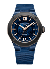 The Riviera 10769 sporty look built on a stone that imparts subtly nuanced hues even as the blue dial reflects the depth of the sea. This version of the Riviera features a dodecagonal case with a diameter of 42 mm. Its exquisite craftsmanship intensifies its luminosity, showcasing its graphic color contrasts and precise time indications. In this bicolor version, the Riviera subtly combines titanium with blue PVD, asserting a proud appearance. Powered by a manufacture Baumatic movement, the timepiece ensures precision, durability, and a five-day power reserve. The built-in blue rubber strap features a canvas pattern. The strap may be changed without the use of tools thanks to a robust, reliable mechanism.