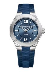 A polished and satin-brushed steel case, an emblematic dodecagonal bezel and a Swiss-made quartz movement with 10-year autonomy: the new Riviera 36 mm does not have mechanics but has a discreet charm and a singular character. Its rubber strap in shades of blue and canvas decor is immediately recognizable thanks to a small label with the Phi logo in the center; giving it a look that is both timeless and desirable! The new Riviera 36 mm "full blue" is a timepiece with an assertive and balanced personality, evocative of a contemporary art of living. Its sun-brushed blue dial is a window opening onto new horizons.