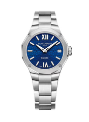 The azure blue of its sun-satin dial, adorned with a transparent wave transfer decoration, brings to mind the color of the water as it mirrors the blazing sun throughout the day. The date appears in an aperture at 3 o’clock, while the hours and minutes are indicated on Roman numerals and riveted indexes coated in Superluminova (C1, blue glow) by faceted rhodium-plated hands. The display is orchestrated by a quartz movement with a ten-year autonomy. The Brand’s emblem, the Phi logo, appears in relief on the free octagonal crown. The watch timepiece is water-resistant to 5 ATM (approx. 50m).