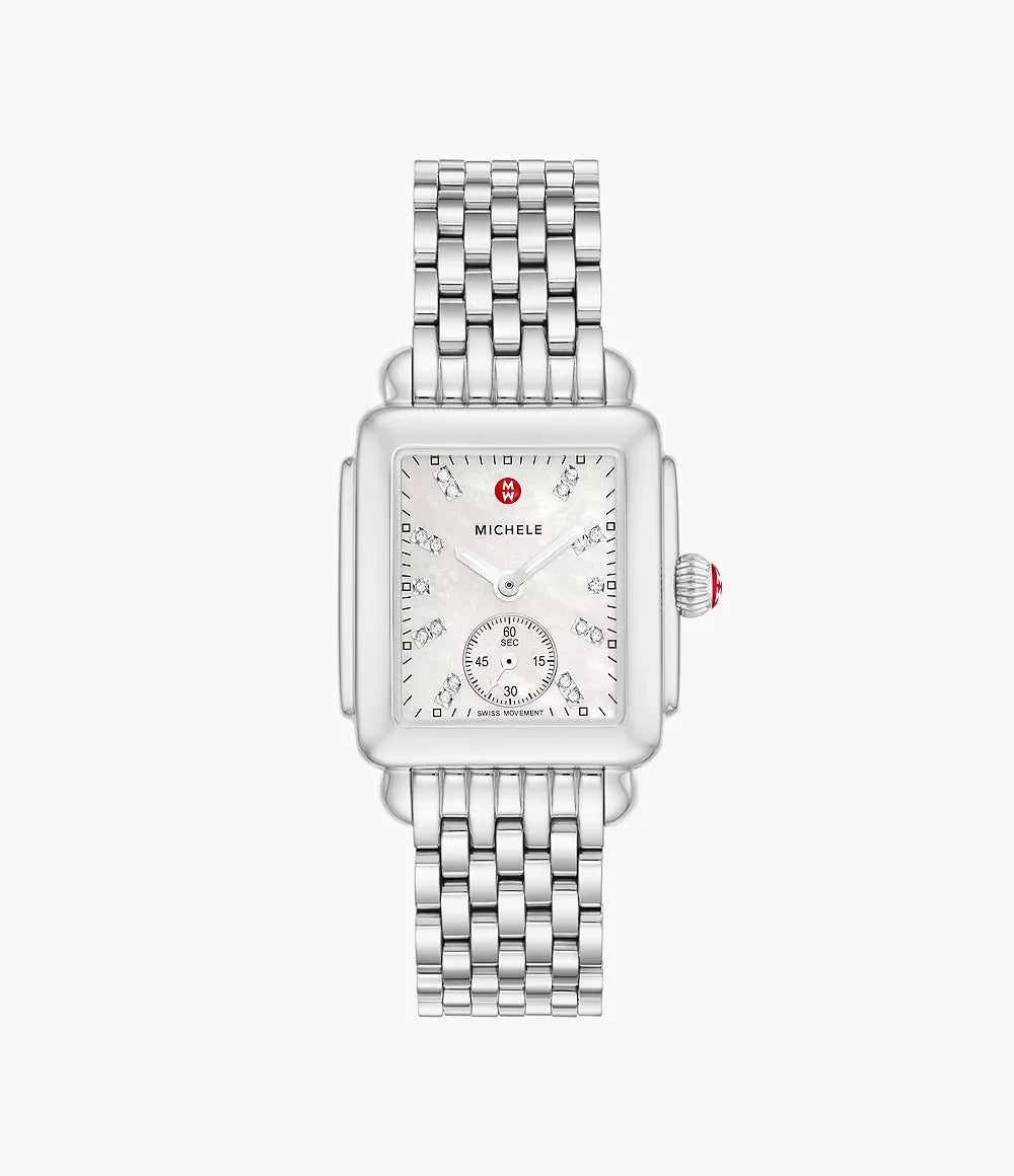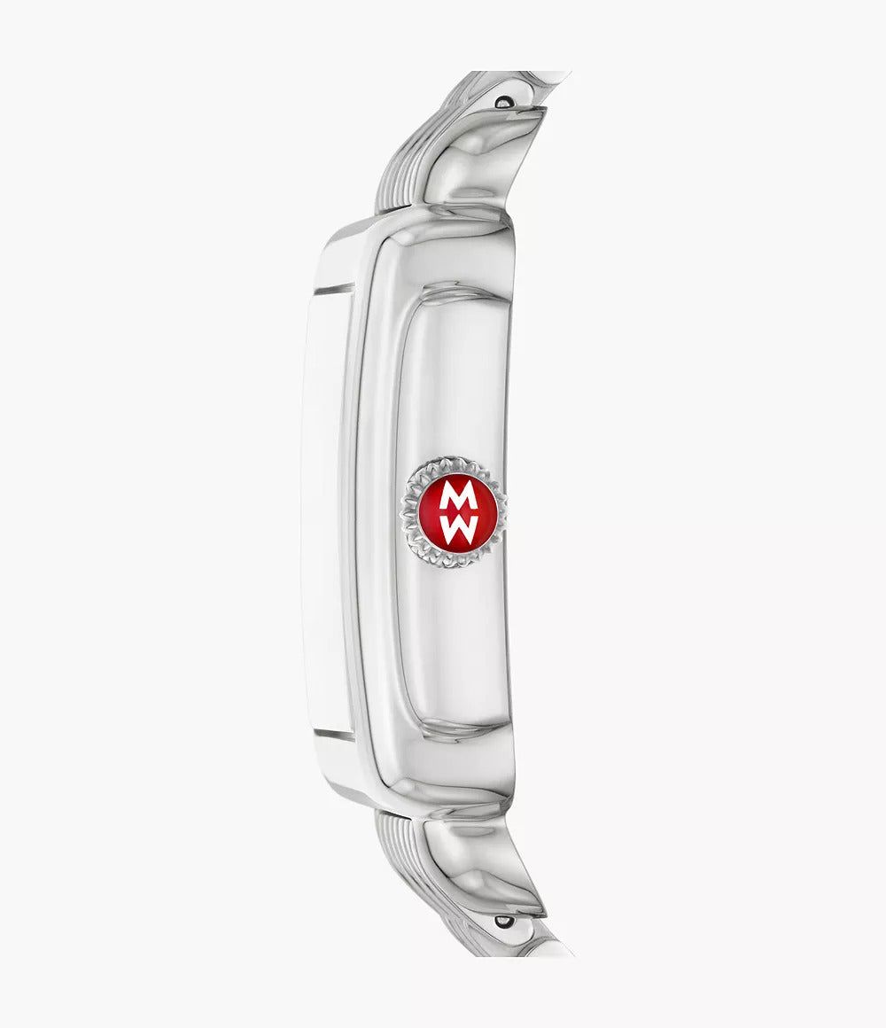 Inspired by the geometric shapes of Art Deco architecture, the Deco Mid timepiece embodies clean, sophisticated style. The mother-of-pearl dial is adorned with diamond hour markings and the signature MICHELE crown accent this stunning timepiece. The stainless bracelet is interchangeable with any 16mm MICHELE strap.