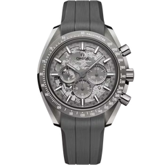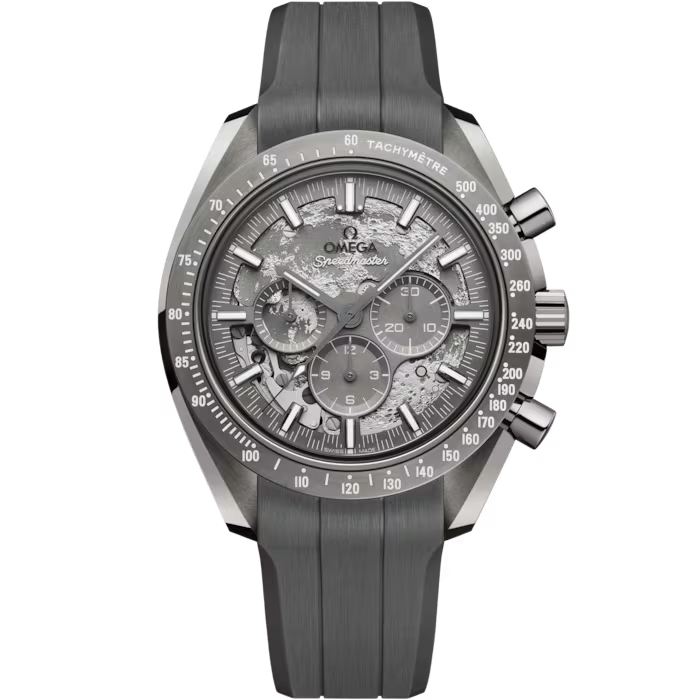 The watch is worn on a grey rubber strap with a moon surface pattern on the underside, a ceramic foldover clasp and ceramised titanium frame-spring folders