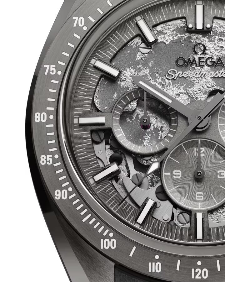 Beneath the front sapphire crystal, OMEGA’s connection to the moon is celebrated via the specially decorated movement, which is laser-ablated on the main plate and bridges to represent the moon’s surface. The near side can be seen on the skeletonized grey anodised aluminium dial, while the far side can be seen through the caseback.