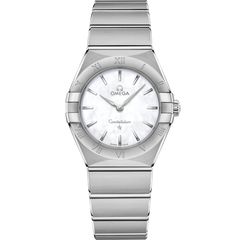 This 28 mm stainless steel model features a bezel engraved with Roman numerals, white mother-of-pearl dial and scratch-resistant sapphire crystal. The hands, OMEGA logo, Constellation star and indexes are in 18K white gold.
