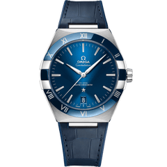 The dramatic and enduring design of the OMEGA Constellation is characterised by its famous half-moons, as well as the “claws” on the side of the case.This 41 mm stainless steel model features a polished blue ceramic bezel with Roman numerals in Liquidmetal™, a sun-brushed blue dial and a date window at the 6 o'clock position. The hands, OMEGA logo, Constellation star and facetted indexes are all rhodium-plated.Presented on a blue leather strap with rubber lining, this timepiece is driven by the OMEGA Co-Axial Master Chronometer Calibre 8900, visible through the domed scratch-resistant sapphire crystal.