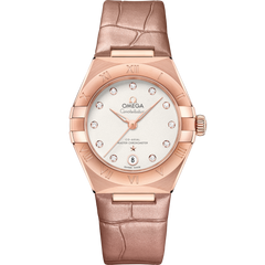 The dramatic and enduring design of the OMEGA Constellation is characterised by its famous half-moon facets and “claws”on the case.This 29 mm 18K Sedna™ gold model features a bezel with engraved Roman numerals, crystal white silvery dial with diamond hour markers and a date window at the 6 o'clock position. The hands, OMEGA logo, Constellation star and diamond holders are also in 18K Sedna™ gold.Replacing the famous mono-rang bracelet is a beige strap in shimmering leather.At the heart of this timepiece is the OMEGA Co-Axial Master Chronometer Calibre 8701, visible through the domed scratch-resistant sapphire crystal.