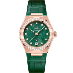The dramatic and enduring design of the OMEGA Constellation is characterised by its famous half-moon facets and “claws” on the case. Standout features on this 29 mm model are the dial made from natural green Aventurine stone and the shimmering leather strap in matching colour. Crafted in 18K Sedna™ gold, it has a diamond-paved bezel and a date window at 6 o’clock. The hands, hour markers, OMEGA logo and Constellation star are in 18K Sedna™ gold. At the heart of this timepiece is the OMEGA Co-Axial Master Chronometer Calibre 8701, visible through the domed scratch-resistant sapphire crystal.