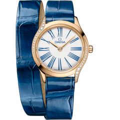 The Mini Trésor is a refined version of OMEGA’s most contemporary ladies’ collection With its compact size and dynamic style, it delivers a truly eye-catching display on the wrist This model in 18K Moonshine™ Gold features a 26 mm case with diamonds that elegantly curve along each side There is also a single diamond set in the crown, surrounded by a red hybrid ceramic flower The domed dial is crafted in off-white “Grand Feu” enamel and is embellished with transferred Roman numerals in blue The watch is presented on a lacquered double-tour blue alligator leather strap with a Trésor buckle It is driven by the OMEGA calibre 4061, which sits behind a special mirrored caseback with a metallised “Her Time” pattern