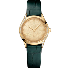 The Mini Trésor is a refined version of OMEGA’s most contemporary ladies’ collection. With its compact size and dynamic style, it delivers a truly eye-catching display on the wrist. This model in 18K Moonshine™ Gold features a 26 mm case with diamonds that elegantly curve along each side. There is also a single diamond set in the crown, surrounded by a red hybrid ceramic flower. The domed dial is crafted in 18K Moonshine™ Gold and is presented with a silk-like pattern that is contrasted with diamond-polished hands and embossed Roman numerals. The watch is presented on a shimmering green alligator leather strap with a Trésor buckle. It is driven by the OMEGA calibre 4061, which sits behind a special mirrored caseback with a metallised “Her Time” pattern.