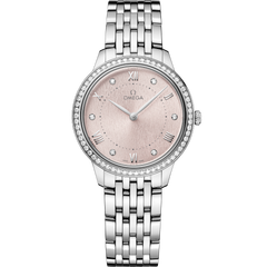 A timeless collection since 1994, the OMEGA De Ville Prestige is now in its third generation Continuing to represent classical design and refined elegance, the timepieces offer a range of patterns, finishes and colours to suit different lifestyles and personalities This 30 mm stainless steel model features a diamond-paved bezel and a PVD rose silvery dial with a stamped random vertical pattern in a sun-brushed finish The display is distinguished by rhodium-plated hands, as well as alternating Roman numerals and diamond markers The pure look of the timepiece is completed by a dotted minute track on the inner zone, and a full caseback embossed with a God Chronos medallion This watch is presented on a stainless steel bracelet and is driven by the OMEGA Quartz Calibre 4061, with a battery life of at least 48 months